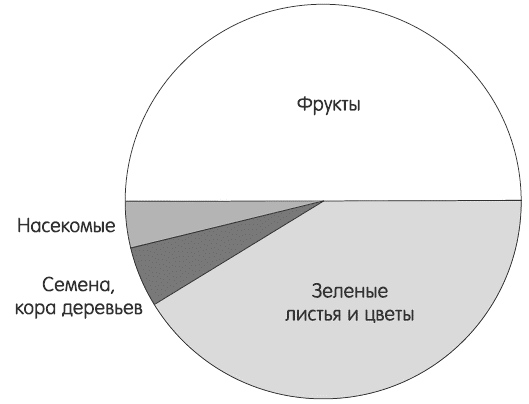 Понимание основ питания шимпанзе поможет нам лучше понять потребности людей. Посмотрите на диаграмму (рис. 1), на которой показан типичный рацион шимпанзе в диких джунглях (я создала ее, основываясь на данных из книги Джейн Гудолл «Шимпанзе из долины Гомбе»).