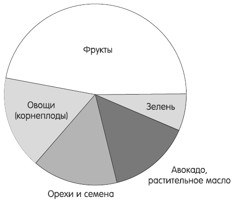 Из диаграммы видно, что сыроеды едят много фруктов, особенно если учитывать, что перец, огурцы, кабачки и помидоры теоретически тоже являются фруктами. Однако даже с учетом того, что сыроеды обычно потребляют заметно больше зелени, зелень почти никогда не составляет 45 % их рациона.
